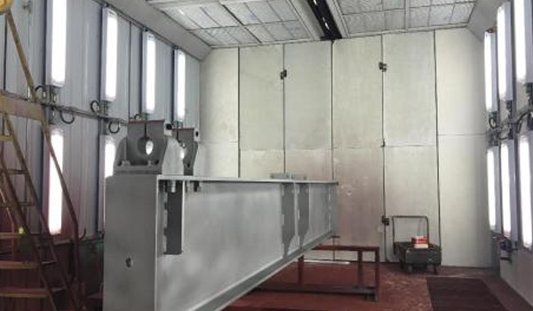 設(shè)備由噴砂房、清理房、底中面漆噴漆房、流平房、烘房、強(qiáng)冷室及輸送系統(tǒng)、電氣控制系統(tǒng)等組成,工藝要求不同,設(shè)備配置略有差異