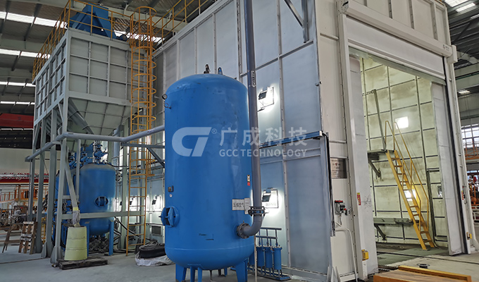 打砂房采用箱式結(jié)構(gòu),配套雙缸四槍連續(xù)加砂噴砂機、機械回收系統(tǒng)、除塵系統(tǒng)